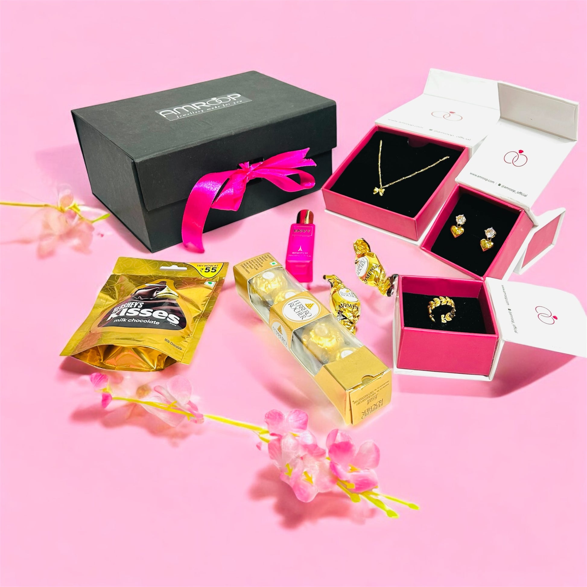 AMROOP’s Jewellery offers gift boxes that'll make any event memorable. Perfect for the special woman in your life, each gift box contains a selection of our most stunning and beautiful jewellery, ensuring you get a thoughtful gift for every occasion, Birthday, Anniversary, Rakhi, sorry or big moment coming up? Our gift boxes it comes along with some tasty chocolates and a high-end perfume. We wrap it all up in a good-looking package. We even include a personalized card to add, and makes it effortless to show how much you care.Elevate your gift giving experience with AMROOP Jewellery and make every moment memorable. Buy now and discover the perfect gift box that combines elegance,luxury and a personal touch.