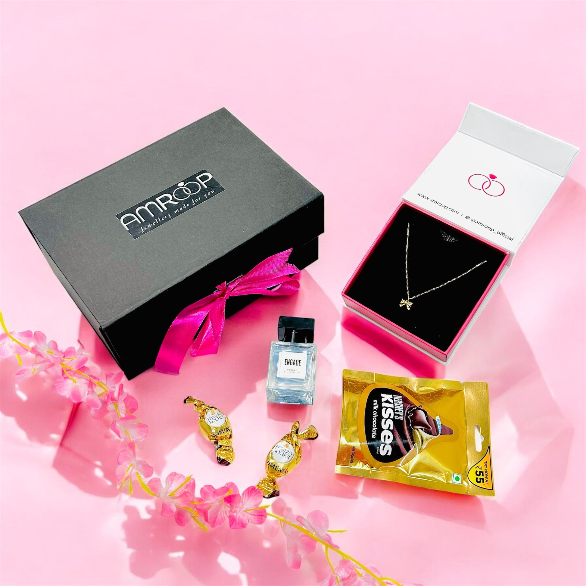 AMROOP’s Jewellery offers gift boxes that'll make any event memorable. Perfect for the special woman in your life, each gift box contains a selection of our most stunning and beautiful jewellery, ensuring you get a thoughtful gift for every occasion, Birthday, Anniversary, Rakhi, sorry or big moment coming up? Our gift boxes it comes along with some tasty chocolates and a high-end perfume. We wrap it all up in a good-looking package. We even include a personalized card to add, and makes it effortless to show how much you care.Elevate your gift giving experience with AMROOP Jewellery and make every moment memorable. Buy now and discover the perfect gift box that combines elegance,luxury and a personal touch.
